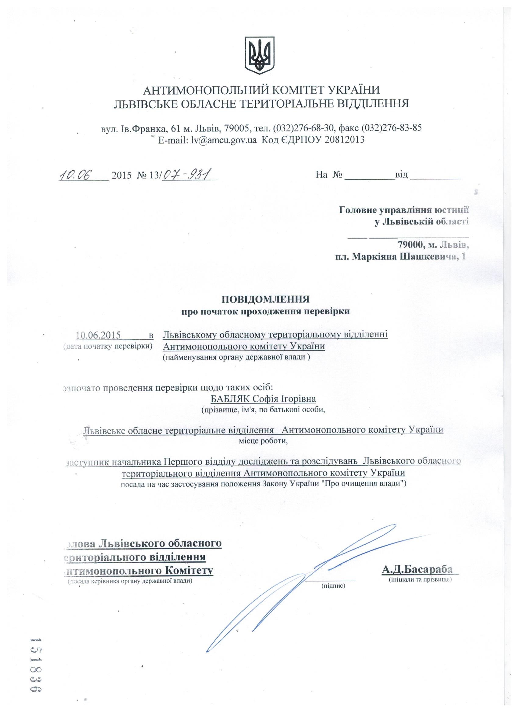 Повідомлення про проходження перевірки відповідно до Закону "Про очищення влади"