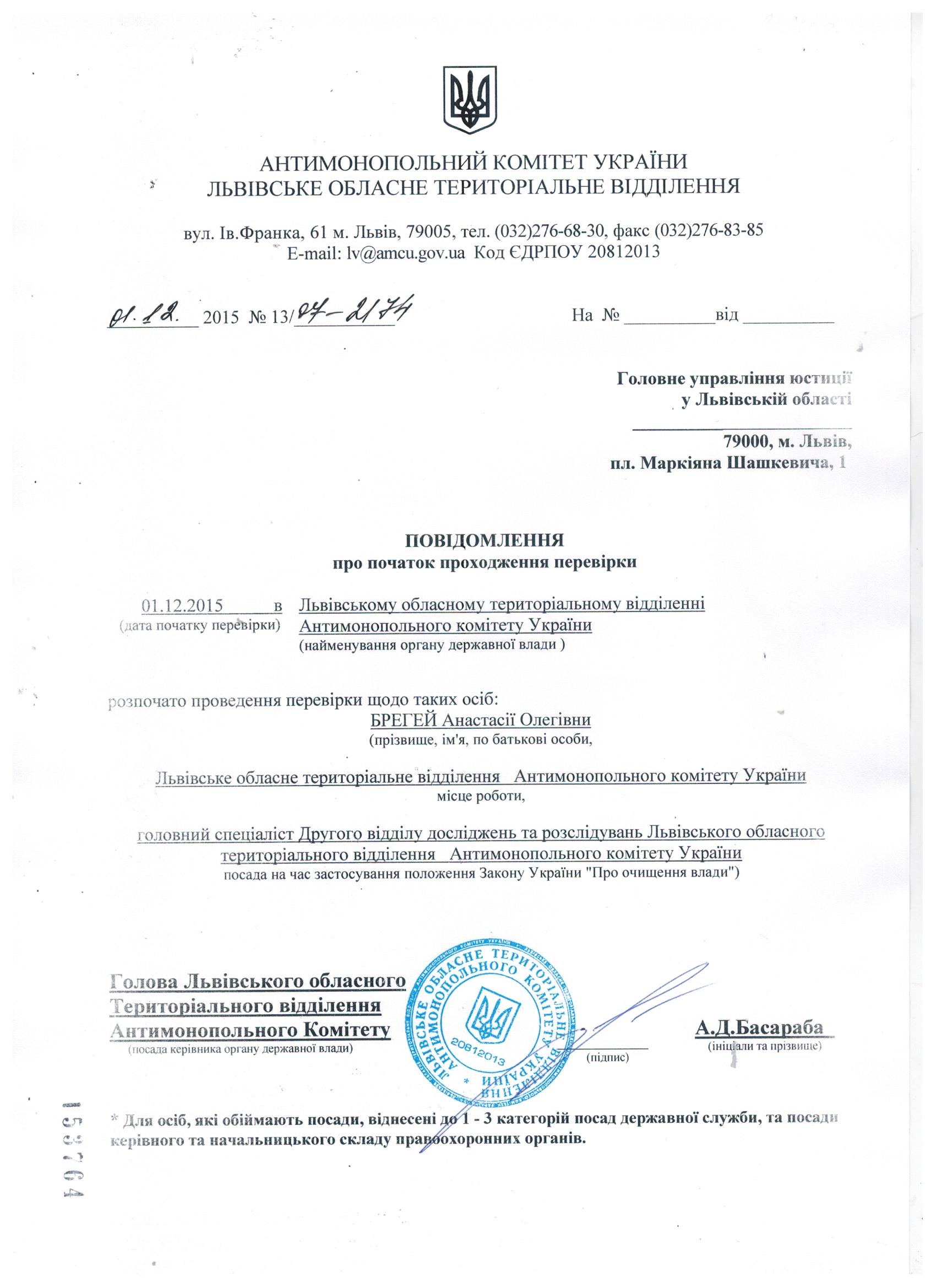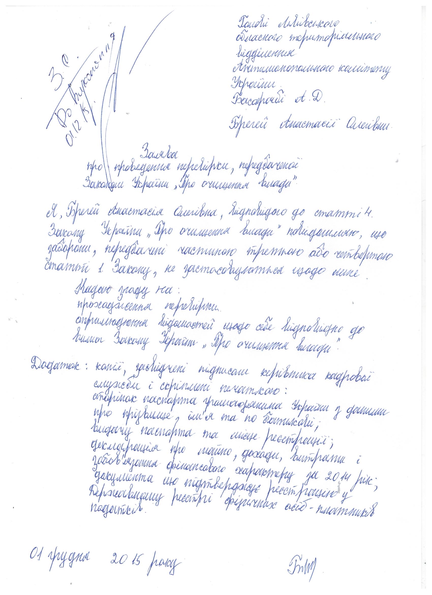 Повідомлення про проходження перевірки відповідно до Закону "Про очищення влади"