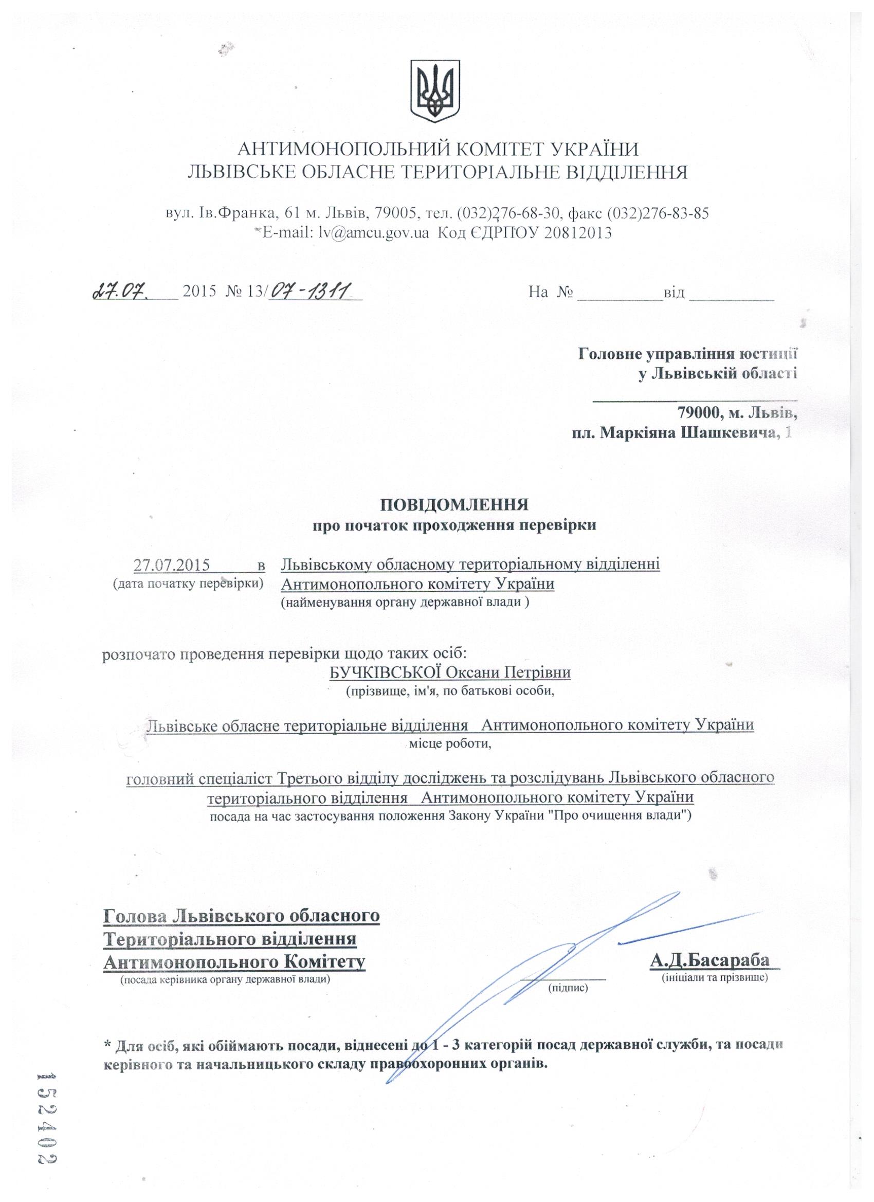 Повідомлення про проходження перевірки відповідно до Закону "Про очищення влади"