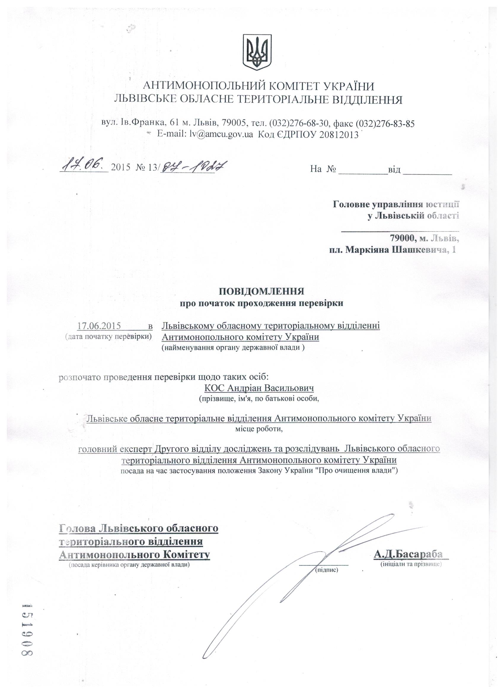Повідомлення про проходження перевірки відповідно до Закону "Про очищення влади"
