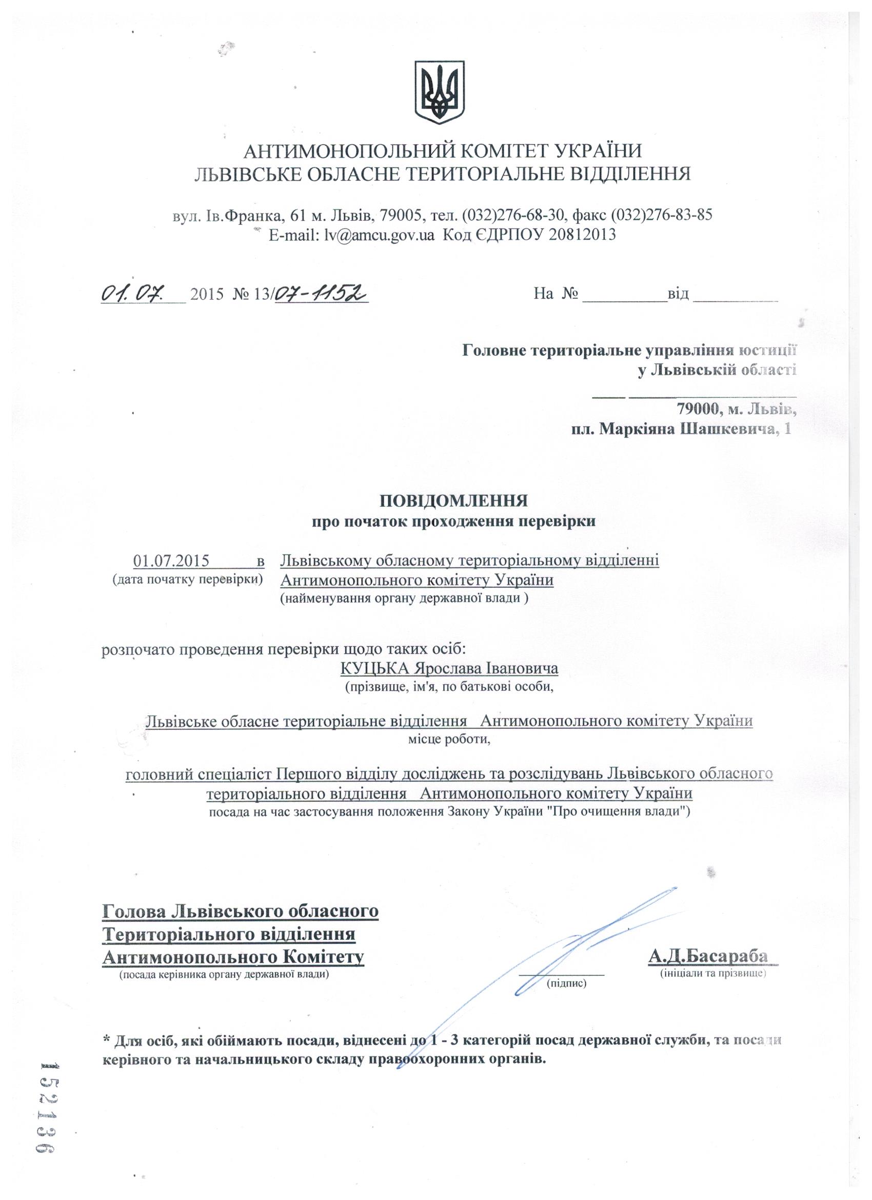Повідомлення про проходження перевірки відповідно до Закону "Про очищення влади"