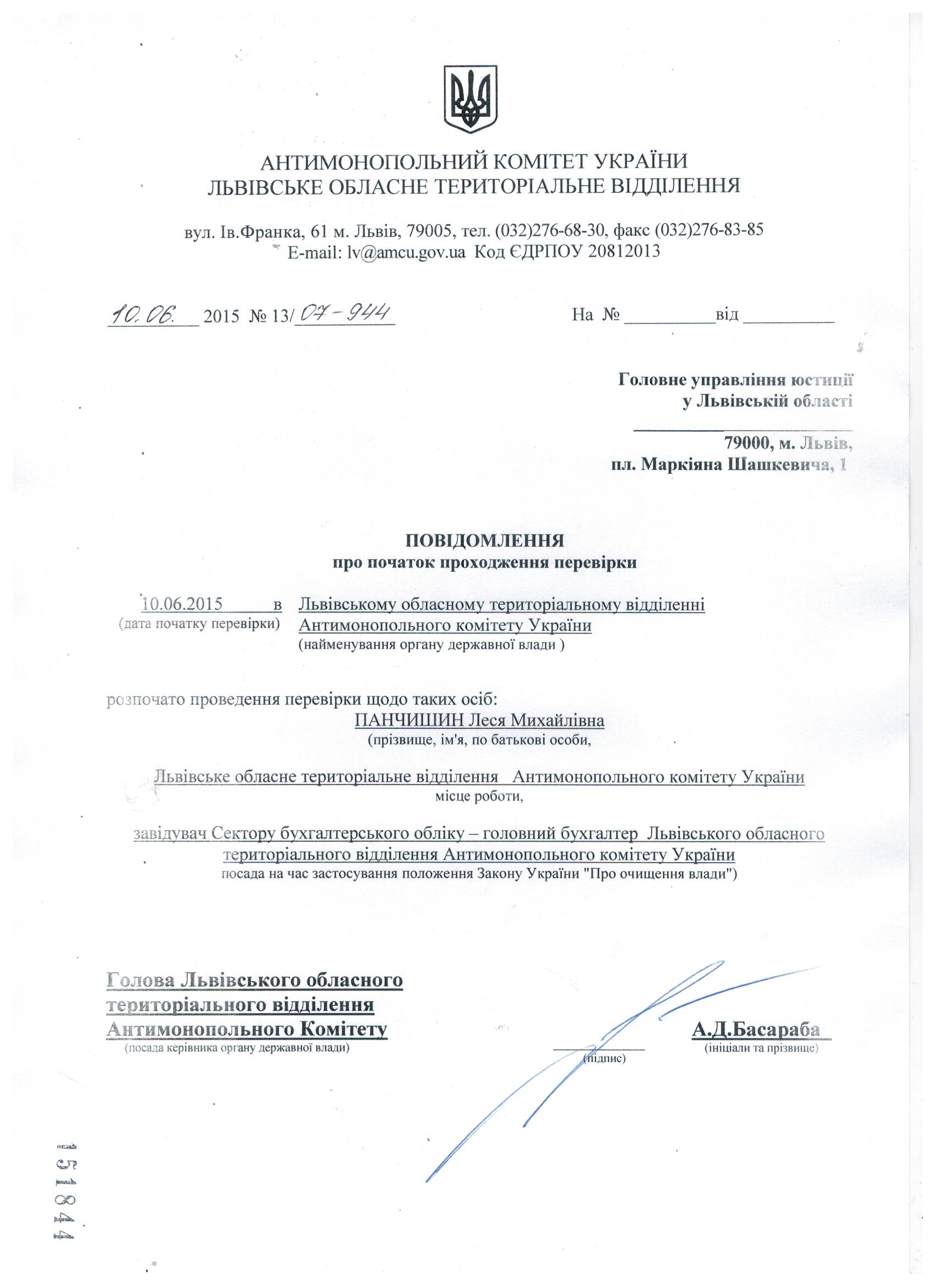 Повідомлення про проходження перевірки відповідно до Закону "Про очищення влади"