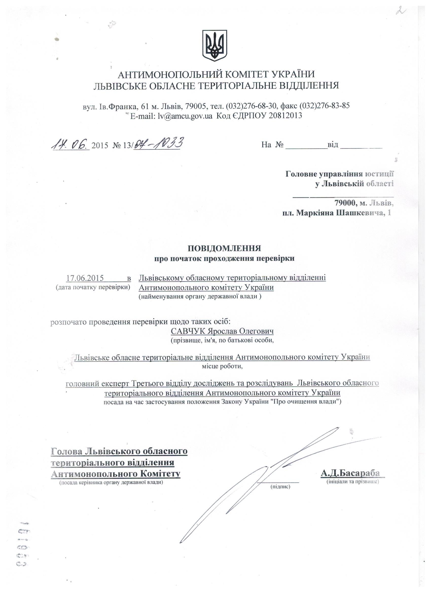 Повідомлення про проходження перевірки відповідно до Закону "Про очищення влади"