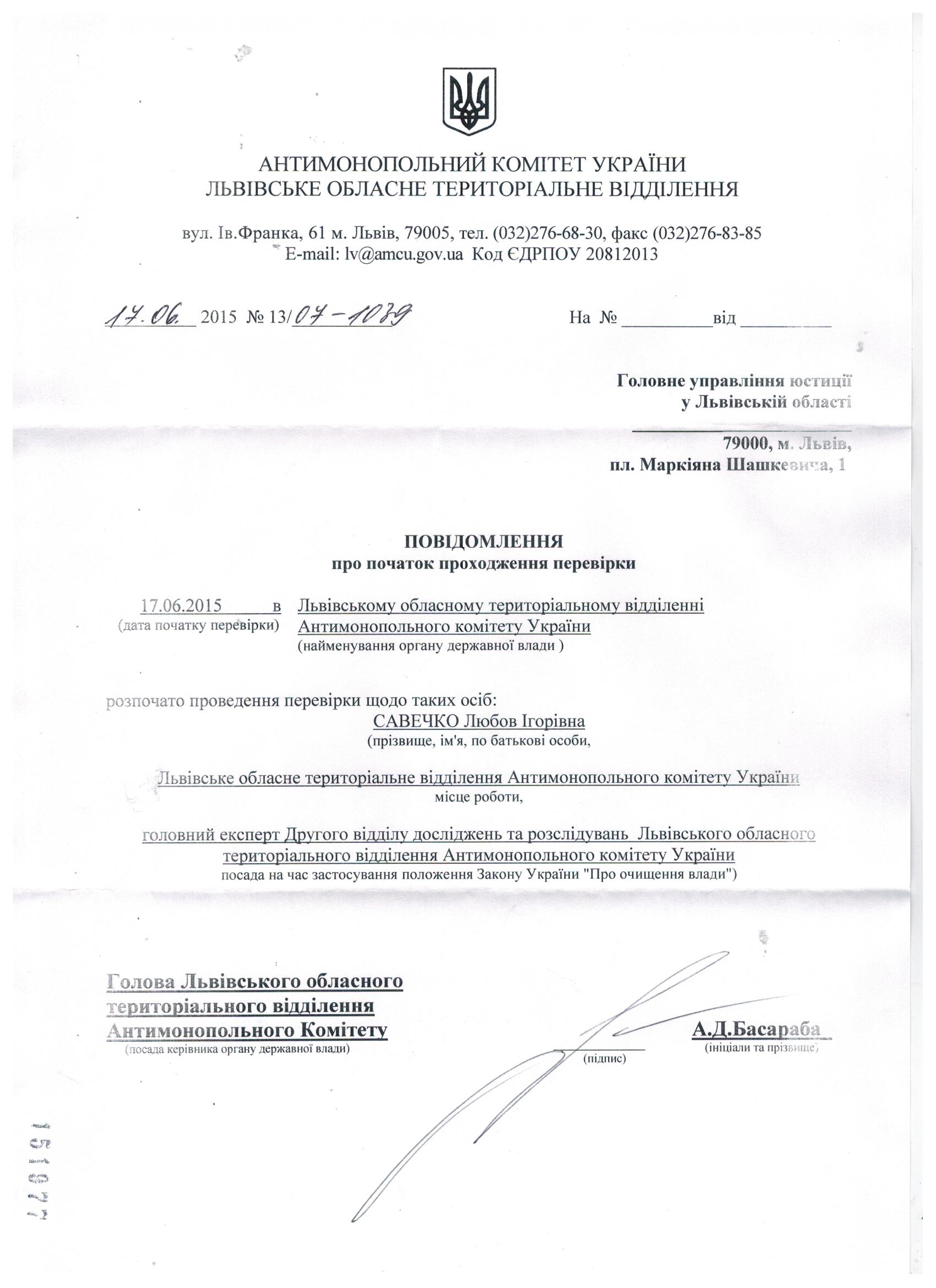 Повідомлення про проходження перевірки відповідно до Закону "Про очищення влади"