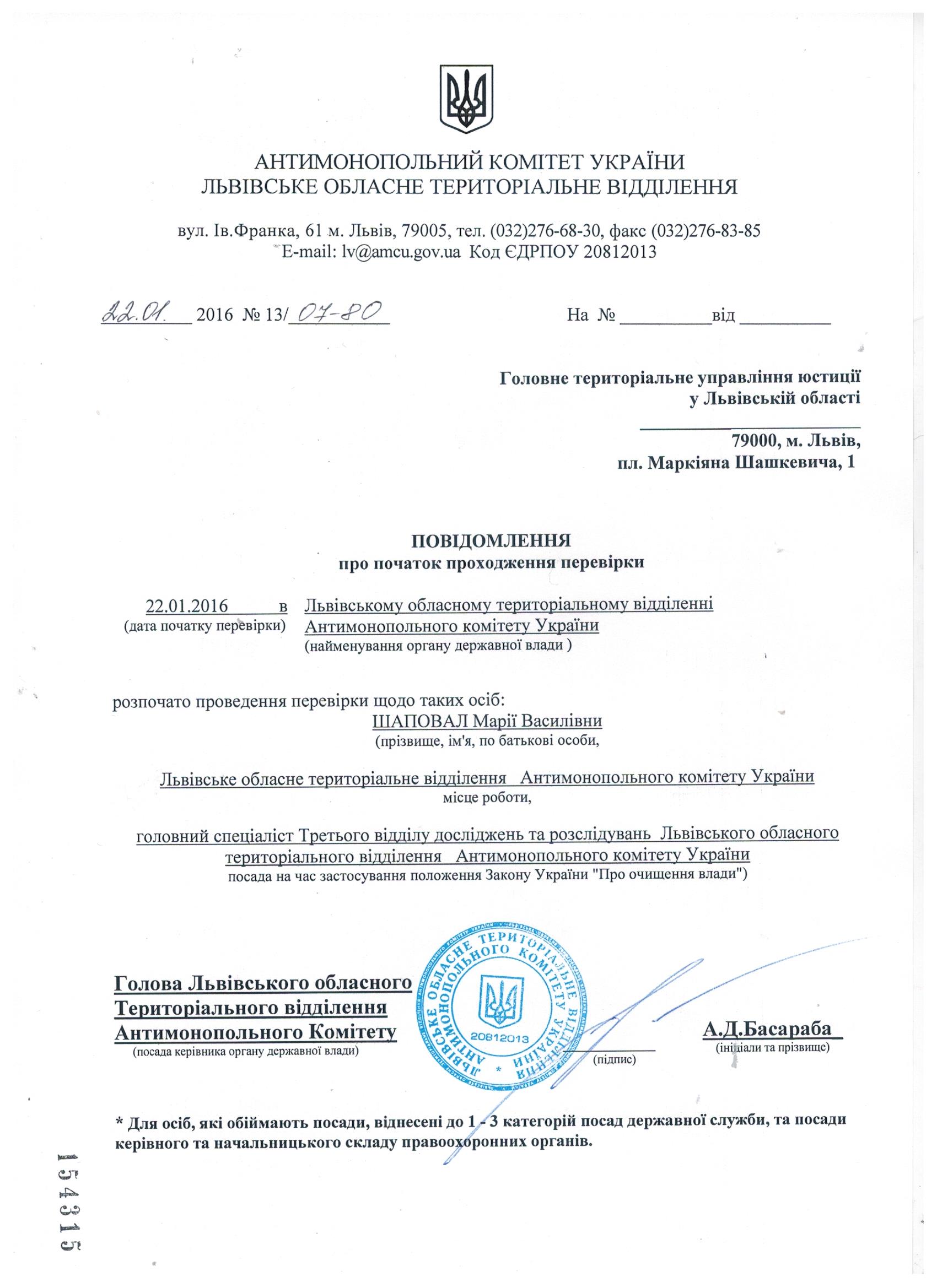 Повідомлення про проходження перевірки відповідно до Закону "Про очищення влади"