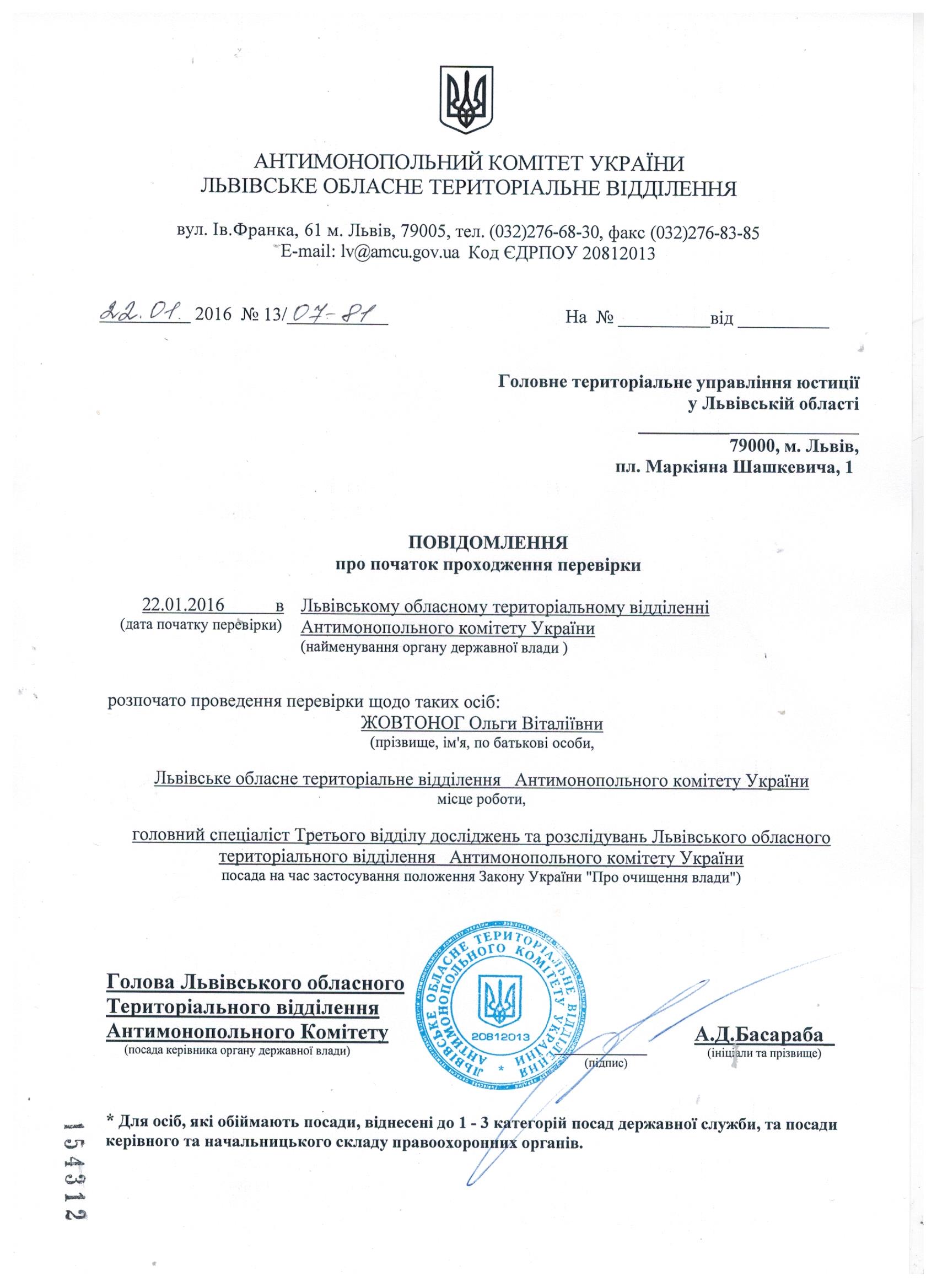 Повідомлення про проходження перевірки відповідно до Закону "Про очищення влади"